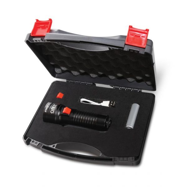 Torcia ancora più potente (28.000 lux – 1200 lumen – 3 ore di utilizzo continuo), in alluminio anodizzato, dotata di molla di ritorno (rimovibile) sull’interruttore per evitare l’accidentale accensione della torcia, fascia elastica da polso, batteria ricaricabile tramite micro-USB. Grazie alle sue caratteristiche è indicata anche per le immersioni con autorespiratore.